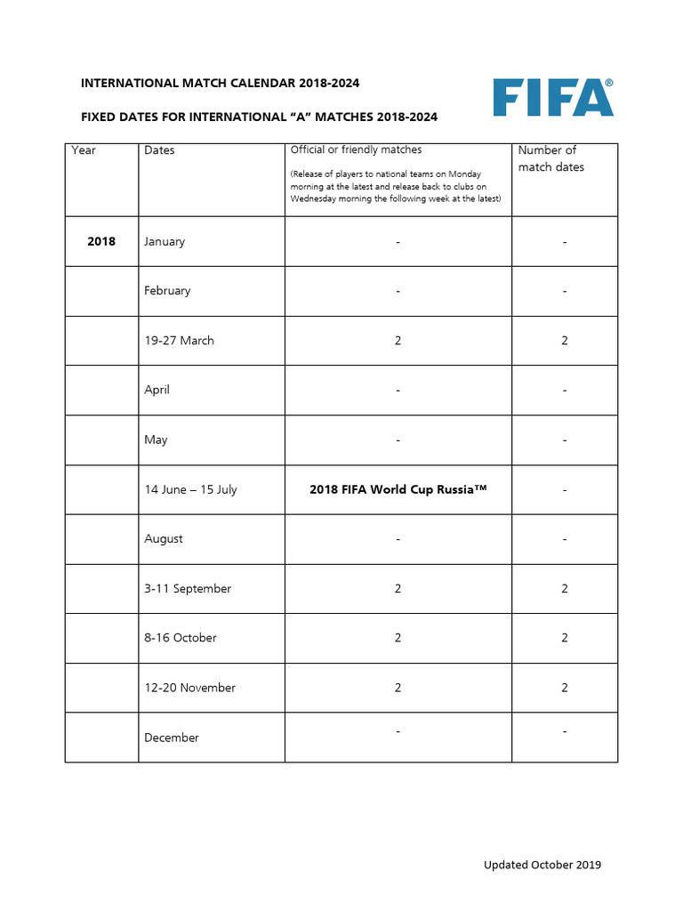 The world’s football governing body said the. In march, june, september, october, and november. 35 rows the current dates are within five windows: International match calendars after consultation with the relevant stakeholders, fifa publishes the international match calendar. After consultation with the relevant stakeholders, fifa publishes the international match calendar (imc) for the period of four or eight years.