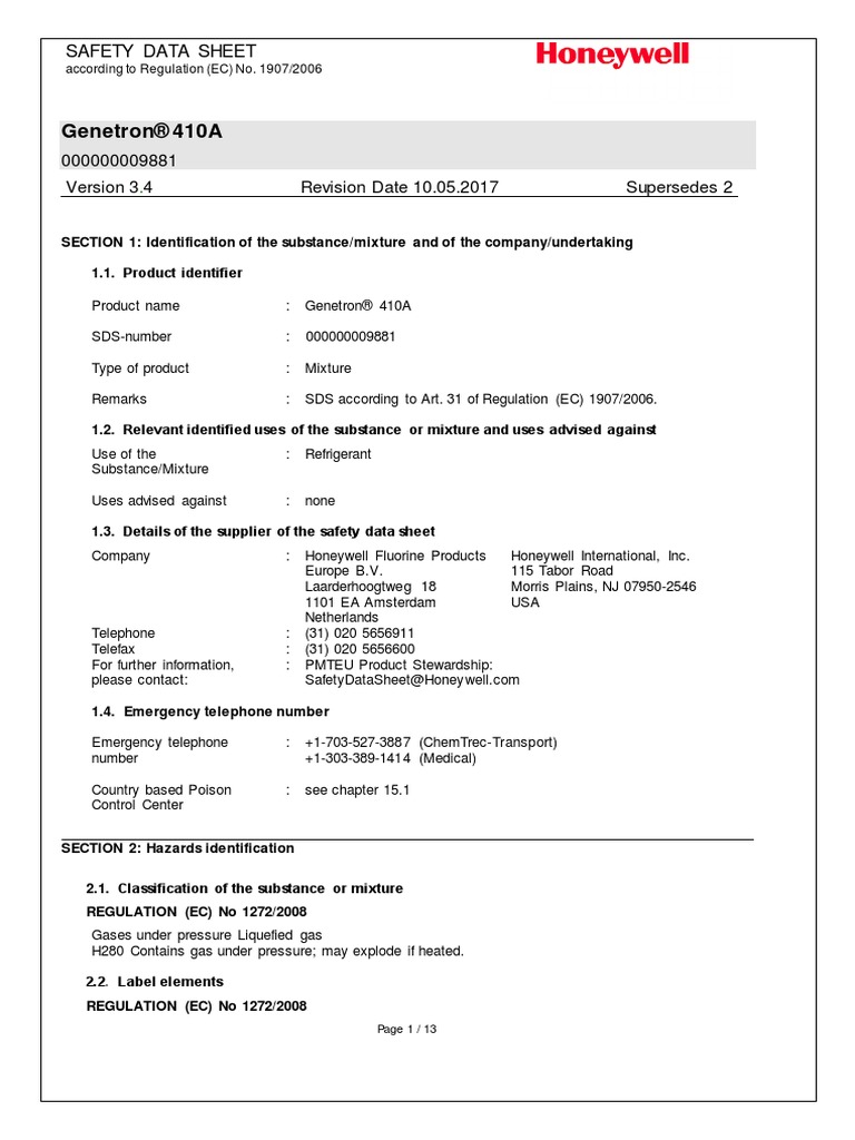 Honeywell Safety Data Sheet PDF Toxicity Water