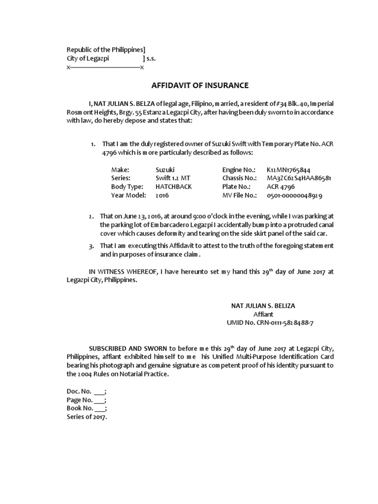Insurance Affidavit Template prntbl.concejomunicipaldechinu.gov.co