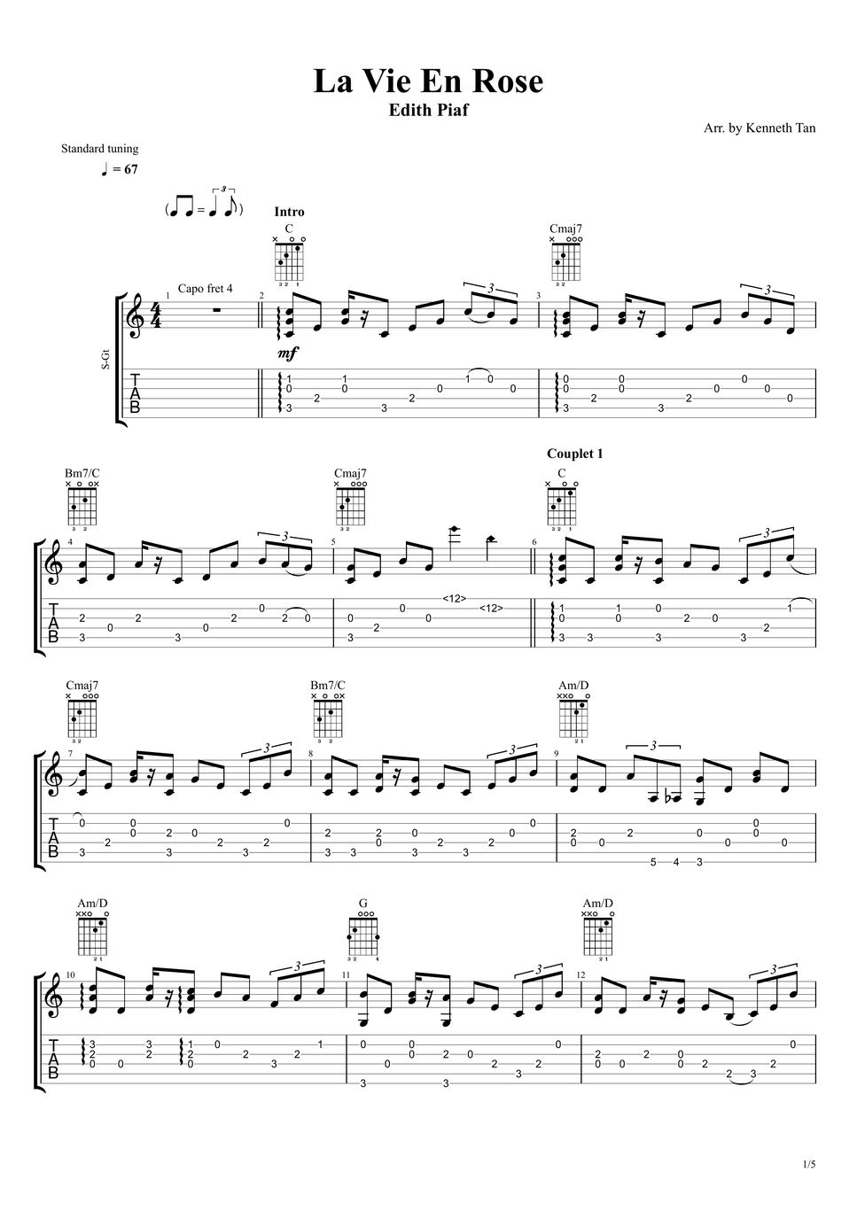Edith Piaf Fingerstyle Guitar La vie en rose Hoja by Acoustic