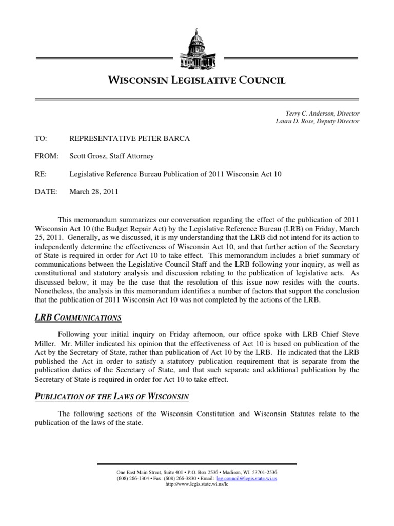 Wis Legislative Council Memo On Act 10 032811 PDF Bill (Law) Veto