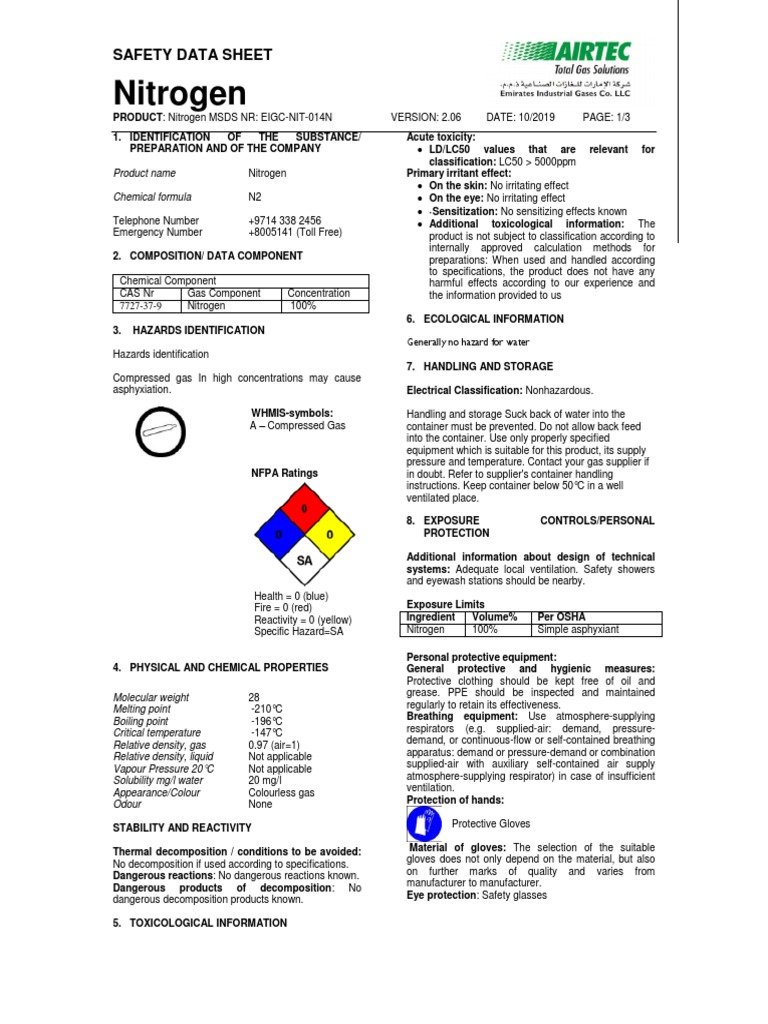 The only health hazard is that it is an asphyxiant and may displace oxygen in a workplace atmosphere. Safety data sheet nitrogen sds no.: 03 page 1 of 12 section 1: Immediately flush eyes with plenty of water, occasionally lifting. Safety data sheet version 6.5 revision date 09/07/2024 print date 09/08/2024 section 1: Identification of the substance/mixture and of.