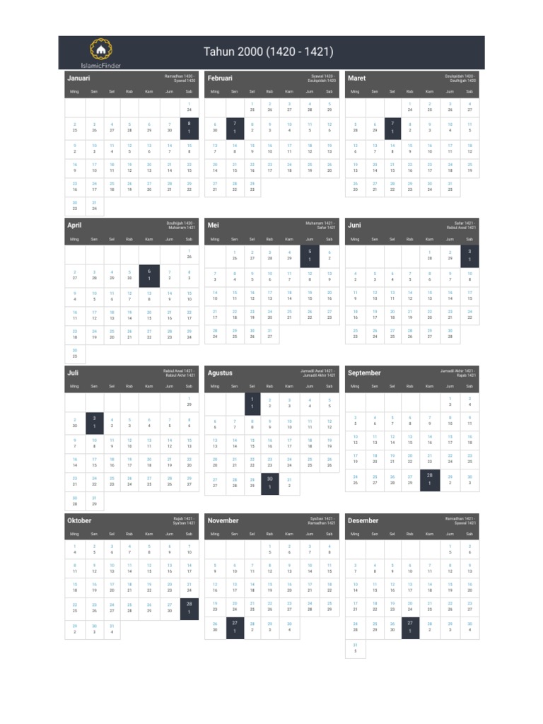 Islamic calendar (hijri) for year 2000 ce, based on the global crescent.