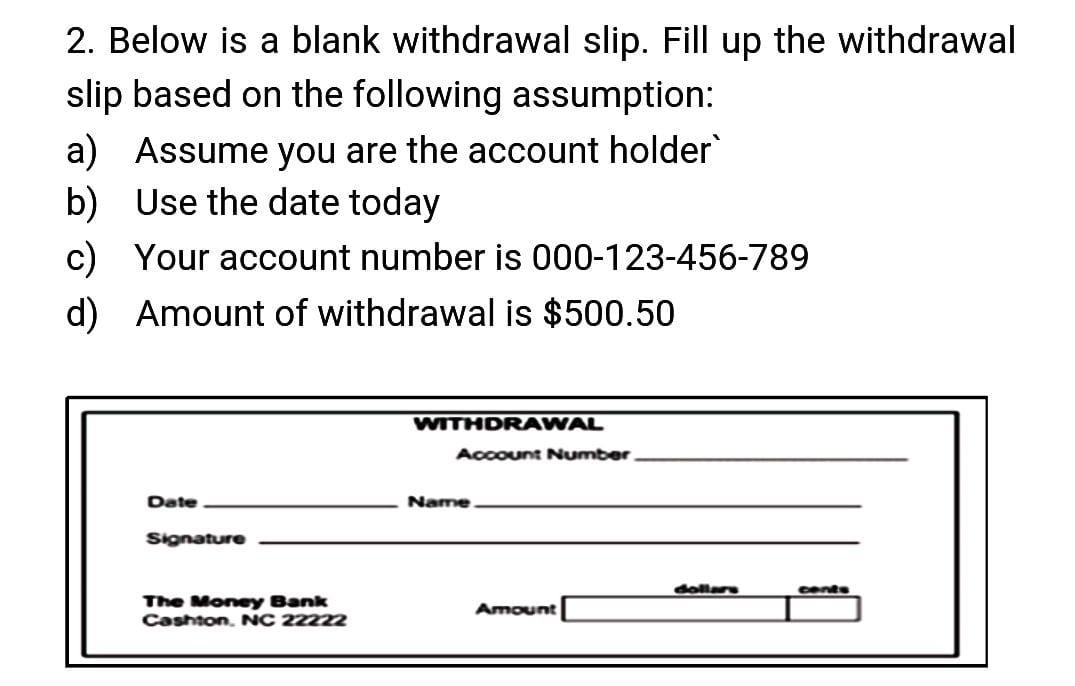 Send how to fill out a withdrawal slip via email, link, or fax. A withdrawal slip is a slip that to be filled by the customer to withdraw money from the bank. A withdrawal slip td bank form is a document used by account holders to withdraw funds. Withdrawal slips are written requests sent to a bank to pay a.